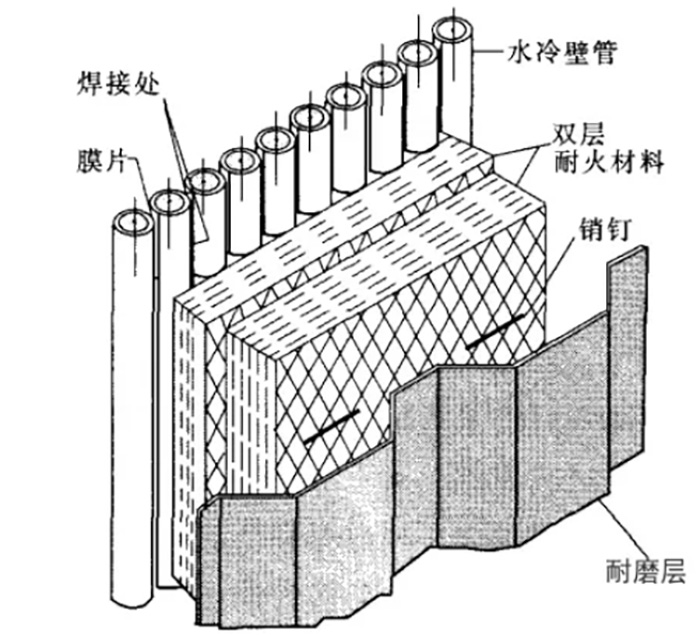如圖1所示,為循環(huán)流化床鍋爐燃燒室下部水冷壁管上耐磨澆注料的施工工藝,耐磨材料是由焊在管子表面上的金屬銷釘固定。由于該區(qū)域?yàn)槿紵蚁虏棵芟鄥^(qū),其物料濃度很高,混合及湍流流動(dòng)非常強(qiáng)烈,所以磨損非常嚴(yán)重。為了防磨,在下部密相區(qū)須襯有一定厚度的耐火、耐磨澆注料。