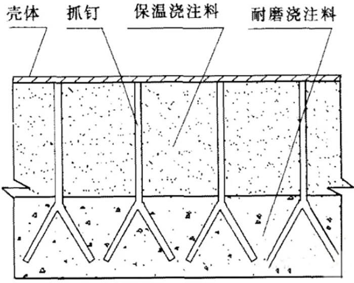 如圖3所示,為耐磨澆注料+保溫澆注料型式,這種結(jié)構(gòu)型式是按一定規(guī)律布置“Y”形抓釘用以固定耐磨襯里,為解決金屬抓釘與耐磨澆注料之間的溫脹差異,抓釘上要涂1mm厚浙青,避免熱態(tài)下由于金屬銷釘與耐火材料的膨脹不同而引起耐火材料的開裂,同時(shí)耐磨澆注料需按2%的比例加入不銹鋼纖維,同樣耐磨襯里要留有適當(dāng)膨脹縫。