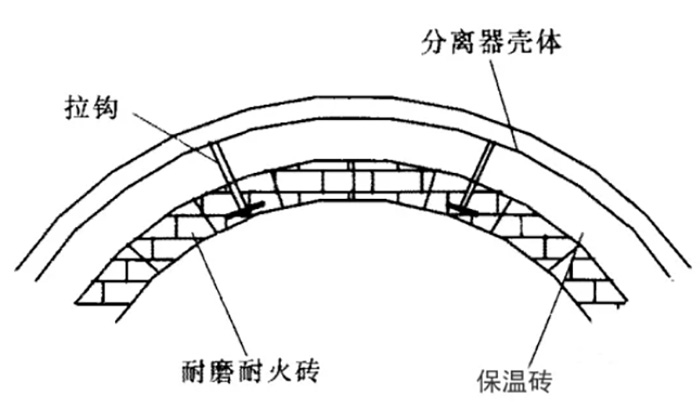 如圖7所示,為分層拉鉤磚結(jié)構(gòu)形式,在分離器的圓筒部分及錐段部分均采取楔形耐磨磚與拉鉤磚配合的這種結(jié)構(gòu),可有效防止耐磨耐火磚的脫落,使任何一塊獨(dú)立的耐磨耐火磚幾乎沒有可能脫落。