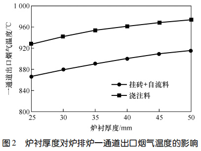 2、對于掛磚+自流料爐襯,掛磚厚度不變時,自流料厚度越大,一通道出口煙氣溫度越高;爐襯總厚度不變時,掛磚越厚、自流料層越薄,一通道出口煙氣溫度越低;爐襯各工作層厚度固定時,一通道出口煙氣溫度隨自流料熱導率的升高而降低,通過調整自流料熱導率,一通道出口煙溫差值可達 70 ℃。