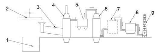 1-料坑; 2-進(jìn)料系統(tǒng); 3-回轉(zhuǎn)窯; 4-二燃室; 5-鍋爐; 6-急冷塔; 7-脫酸塔; 8-除塵; 9-煙囪