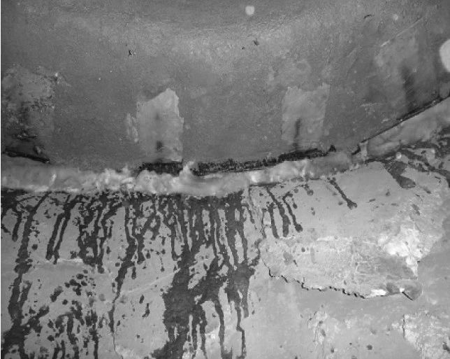 3、耐磨可塑料施工。可塑料敷設(shè)在施工構(gòu)件上后,用木錘或橡皮錘搗打密實(shí)。塊與塊之間的接縫也應(yīng)搗打密實(shí),使接縫嚴(yán)密,將表面壓光、壓平。所施工部位與原來墻體接縫處應(yīng)確保平滑過渡,不得凹進(jìn)或凸出。用磷酸鋁溶液浸泡硅酸鋁纖維板封堵膨脹縫,避免鍋爐運(yùn)行過程中出現(xiàn)竄風(fēng)現(xiàn)象,導(dǎo)致非金屬補(bǔ)償器燒損。耐磨可塑料施工完畢后的膨脹縫封堵如圖4所示。