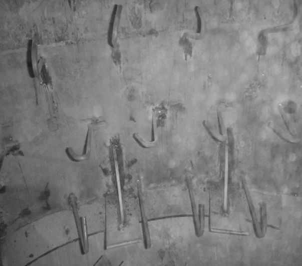 (4)原錨固件為Y銷釘,每隔150mm交錯(cuò)布置,銷釘端部沒有鋼筋網(wǎng)格,使耐火材料無法形成整體,個(gè)別銷釘失效后會(huì)使局部耐火材料松動(dòng),相鄰耐火材料之間沒有可靠聯(lián)系,zui終脫落。