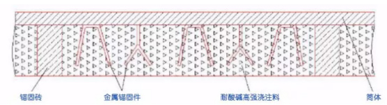 采用上述澆注料在回轉(zhuǎn)窯筒體的內(nèi)表面上澆注厚度不低于250mm。內(nèi)襯包括多塊呈軸向均勻分布固定于筒體內(nèi)表面的酸性或中性錨固磚,錨固磚兩側(cè)的筒體內(nèi)表面固定有多個(gè)均勻分布的金屬錨固件,再用耐酸堿高溫澆注料,該耐酸高強(qiáng)澆注料通過(guò)錨固磚和金屬錨固件與筒體連接為一體。局部?jī)?nèi)襯結(jié)構(gòu)如圖1所示。